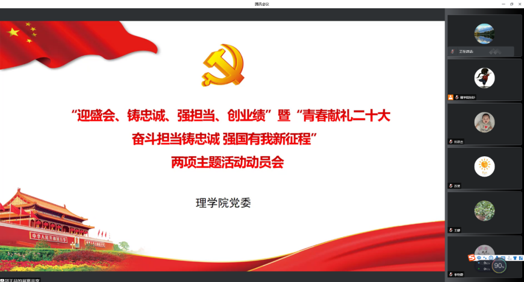 为进一步巩固党史学习教育成果,迎接党的二十大胜利召开,理学院党委于5月4日以线上线下相结合的方式召开“迎盛会、铸忠诚、强担当、创业绩”主题学习宣传教育实践活动暨“青春献礼二十大 奋斗担当铸忠诚 强国有我新征程”主题宣传教育活动动员部署会。会议由理学院党委书记谈廷风主持,学院全体教职工及学生党员、发展对象、积极分子代表参加会议。