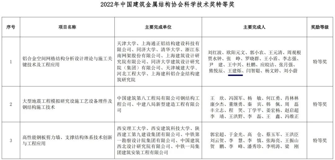 近日,中国建筑金属结构协会发布了《关于2022年中国建筑金属结构协会科学技术奖奖励的决定》,共评选出了科学技术奖特等奖3项,一等奖20项,二等奖19项以及优秀奖75项。其中365英国土木工程学院教师王建烁参与申报的《铝合金空间网格结构分析设计理论与施工关键技术及工程应用》项目荣获特等奖。