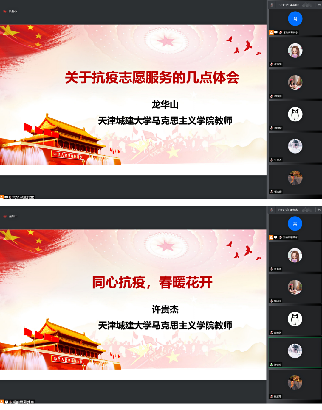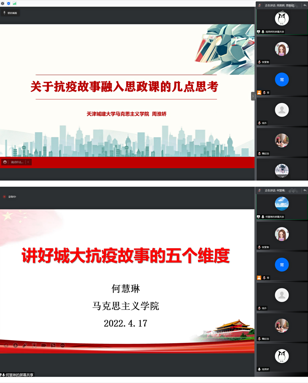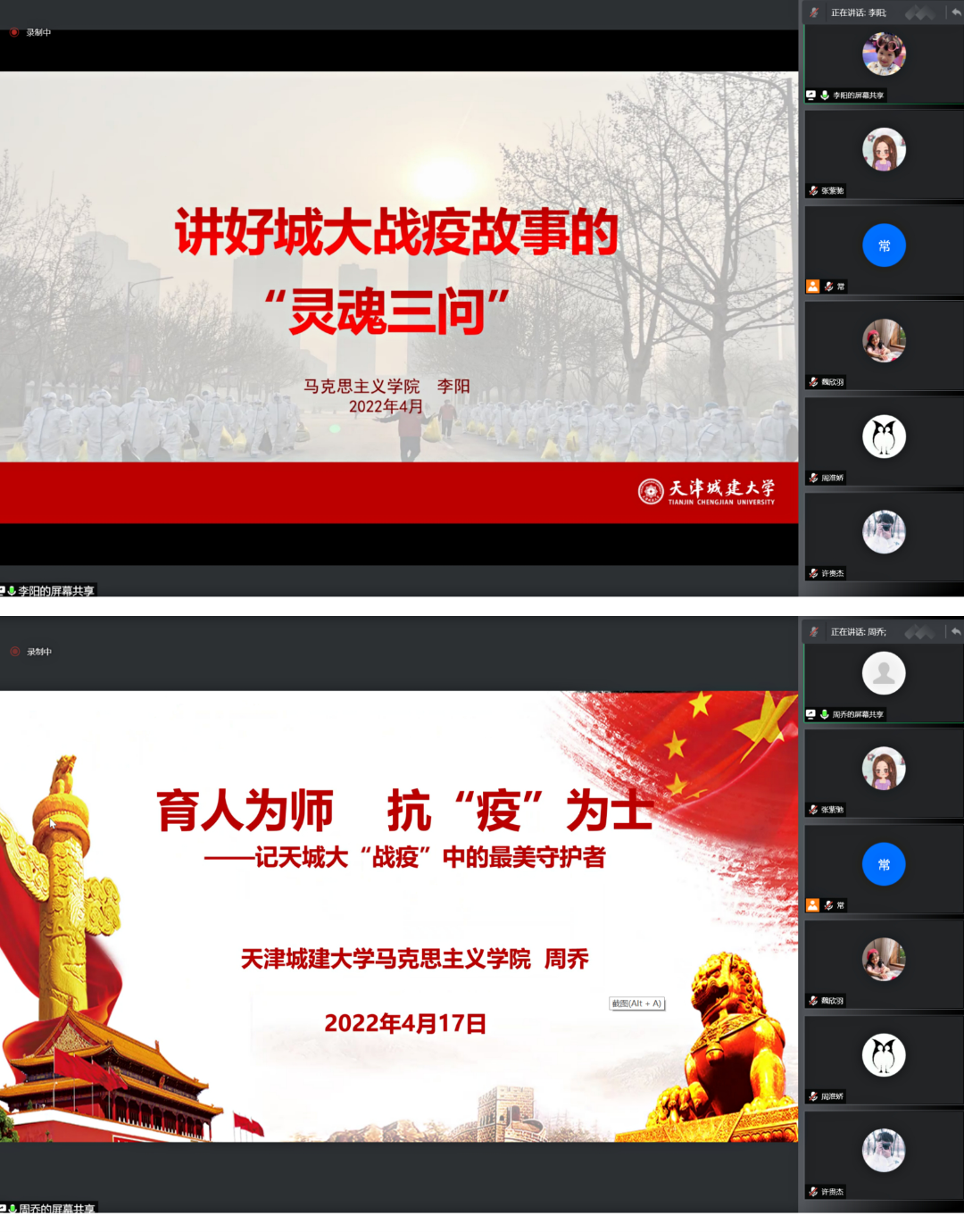 为讲好城大抗疫故事,打造城大特色抗疫思政课,4月17日,马克思主义学院举办线上抗疫志愿活动交流会暨抗疫案例融入思政课集体备课会。学院党总支书记高燕、院长张广森参加会议,副院长贾恒欣主持会议,第一批入校的17名教师志愿者参加了会议。