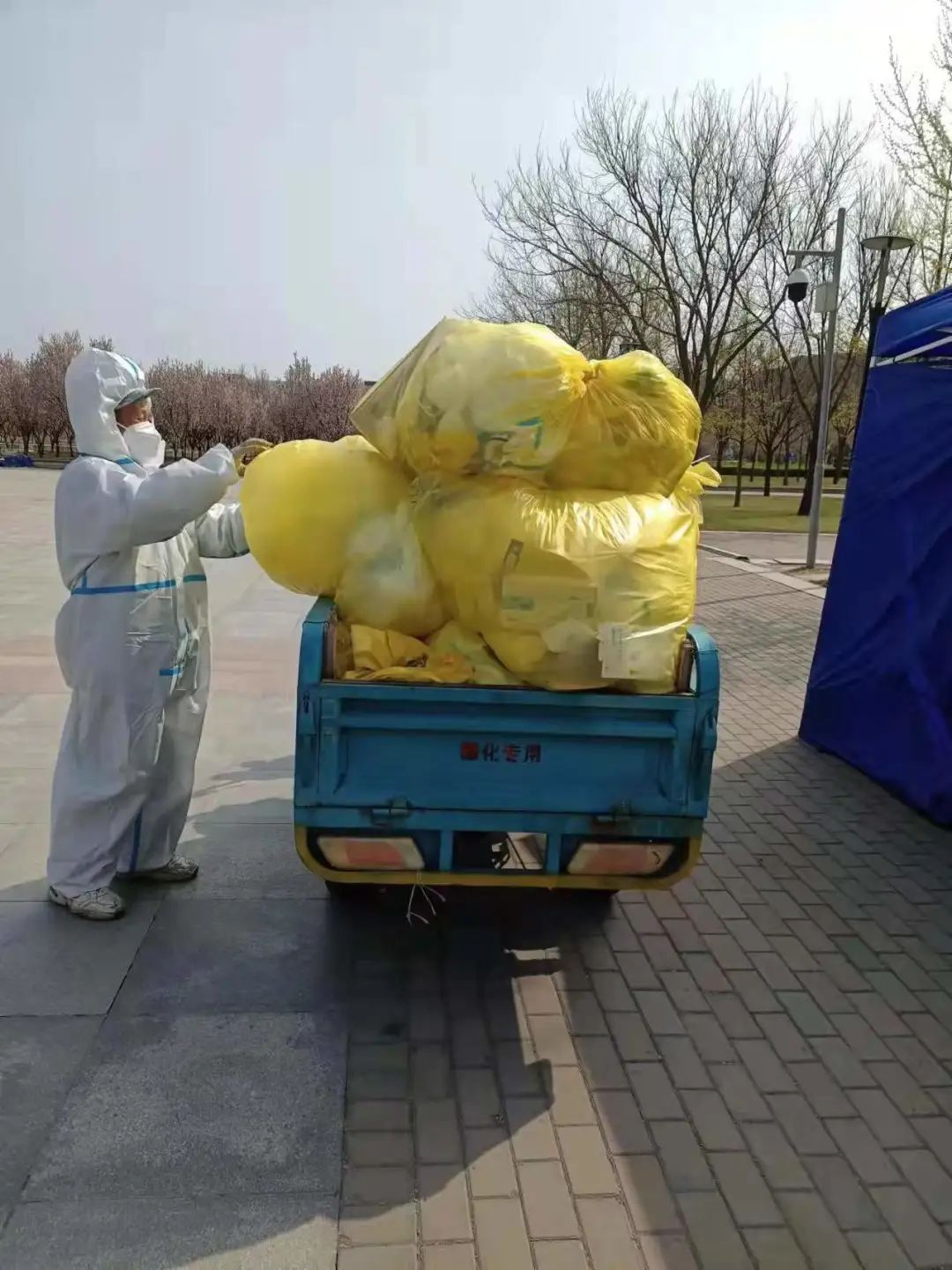 李革师傅负责医疗垃圾收集,他每天身着防护服,穿梭于隔离点、学生公寓间,将医疗垃圾桶内的垃圾清空、装袋,堆放在指定区域等待转运。集中核酸采样期间,李师傅也是全程保障,一人负责全校所有医疗垃圾的装袋转运工作。