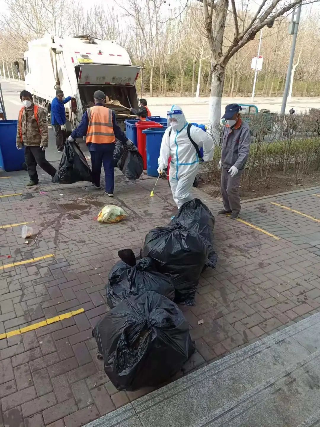 张连周、董训平两位师傅负责环境消杀,每天5点准时跟随垃圾清运车的装车轨迹,将所有垃圾收集点位及垃圾桶消杀一遍,直到8点左右才能趁清运车转运间隙简单地吃一口早饭,之后又投入到新一轮的消杀作业中。这样的循环,最多的时候一天要重复五次,他们一直忙到天黑,有时午饭都顾不上吃。当垃圾清运车消失在夜色中,两位师傅消杀完最后一个点位,卸下作业工具的那一刻,他们累的腰都直不起来。