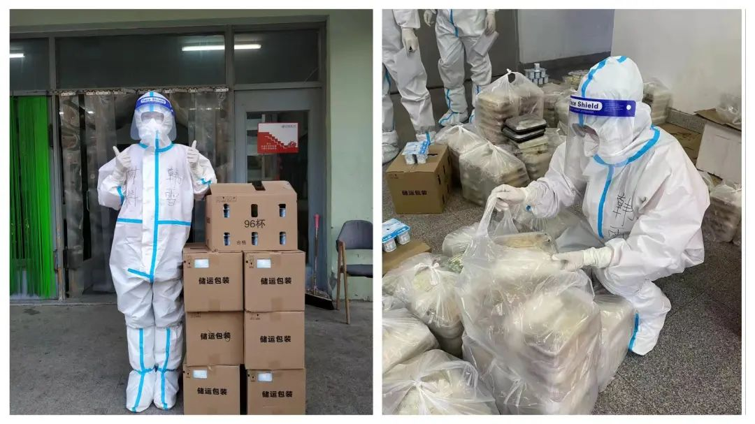 韩雪,材料科学与工程学院教师,中共党员。面对疫情,承担崇礼斋600多名学生的核酸检测秩序维护和楼内物资配送工作。每天早7点来到宿舍楼,身穿防护服维护核酸检测秩序,分发早午晚餐、水果、酸奶、矿泉水,带领学生打热水、洗澡,连续工作12 小时。防护面罩上的水汽模糊了视线,N95口罩在脸上勾勒了勒痕,防护服内的衣服湿了又湿,这些都不能阻止为学生带去温暖的步伐。