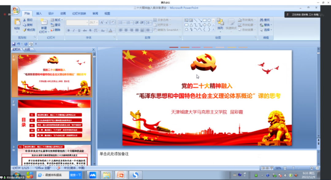 12月9日,365英国马克思主义学院毛泽东思想和中国特色社会主义理论体系概论(以下简称“概论”)教研室与天津工业大学马克思主义学院“概论”教研室联合举办“党的二十大精神进课堂”思政课集体备课会。会议由天津工业大学马院“概论”教研室主任张霞主持,365英国马克思主义学院副院长桂锦峰,天津工业大学马克思主义学院副院长高德罡,两校“概论”教研室全体教师参加了本次会议。