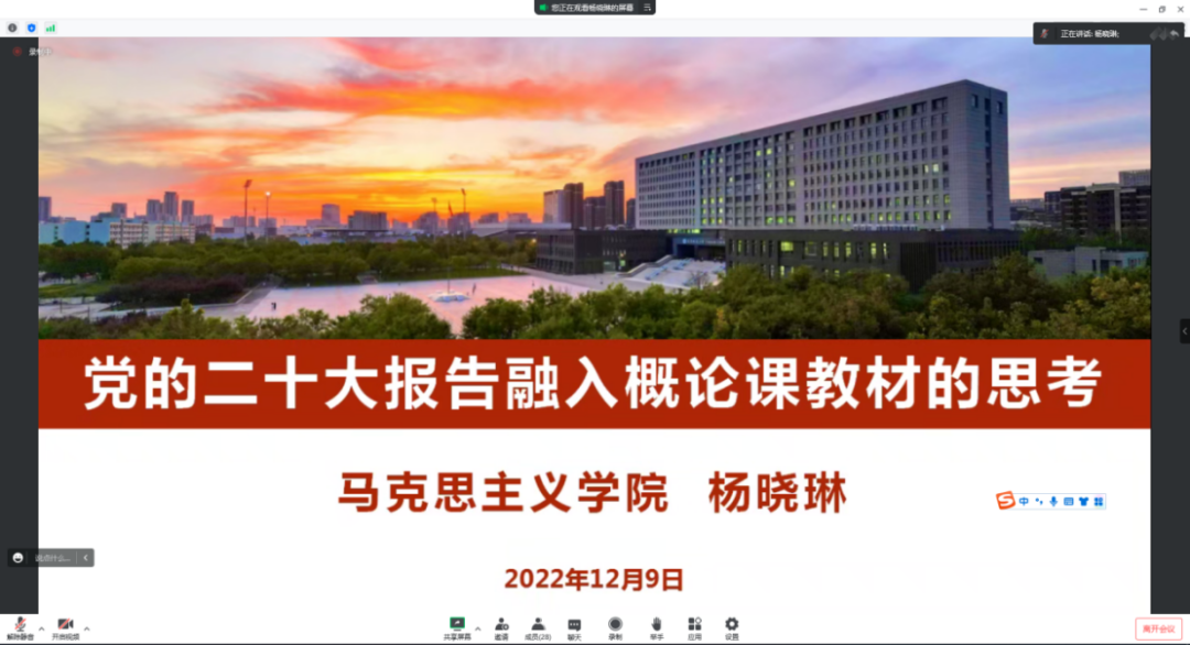 在交流讨论环节,365英国教师屈彩霞、郭俊丽、杨晓琳,天津工业大学教师吕瑞林、高莉娟分别作交流发言。屈彩霞以“党的二十大精神融入《毛泽东思想和中国特色社会主义理论体系概论》课的思考”为题,阐述了党的二十大精神融入“概论”课教学要运用鲜活的实践素材,风趣的语言表述,找准融入的视角与耦合点,做到精准融入,提升教学质效。郭俊丽以“党的二十大精神融入《毛泽东思想和中国特色社会主义理论体系概论》的一些思考”为题,以党的二十大报告中关于共同富裕的相关论述为例,详细介绍了融入“概论”课教学的案例和方法论。杨晓琳从宏观、中观、微观三个维度,分享了如何将党的二十大报告内容与教材体系、教学内容相结合的思考,并以“党的领导是中国特色社会主义最本质的特征”为例,从实践逻辑、理论逻辑、制度逻辑、文化逻辑四个层面,阐述了将党的二十大报告有机融入“概论”课教学的具体做法。