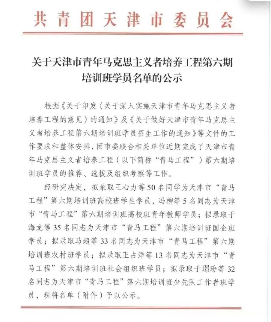 今年6月以来,学校认真贯彻落实《关于深入实施天津市青年马克思主义者培养工程的意见》及《关于做好天津市青年马克思主义者培养工程第六期培训班学员招生工作的通知》等相关文件精神及工作要求,启动了天津市“青马工程”高校培养对象推荐选拔工作,经过公开报名、学院审核、笔试、面试和组织考察等环节,根据综合表现确定最终推荐人选。