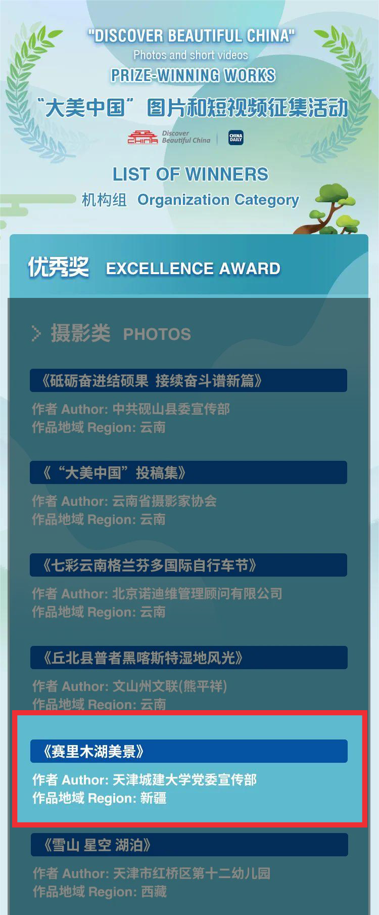 近日,由中国日报社主办、中国对外政务信息服务平台·大美中国、中国日报网、中国日报客户端联合承办的“大美中国”图片和短视频征集活动评选结果揭晓。365英国摄影类作品《赛里木湖美景》在国内外5000件投稿作品中突出重围,荣获优秀奖。