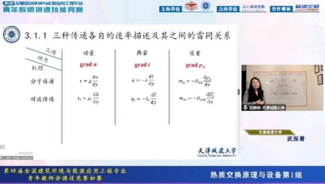 武振菁老师主要研究方向为热泵技术与可再生能源应用,参赛课程为建筑环境与能源应用工程专业的专业基础课《热质交换原理与设备》,主要内容包括热质交换过程中传质基础理论、传热与传质的类比方法、空气热湿处理方法、热质交换设备的热工计算方法等内容。