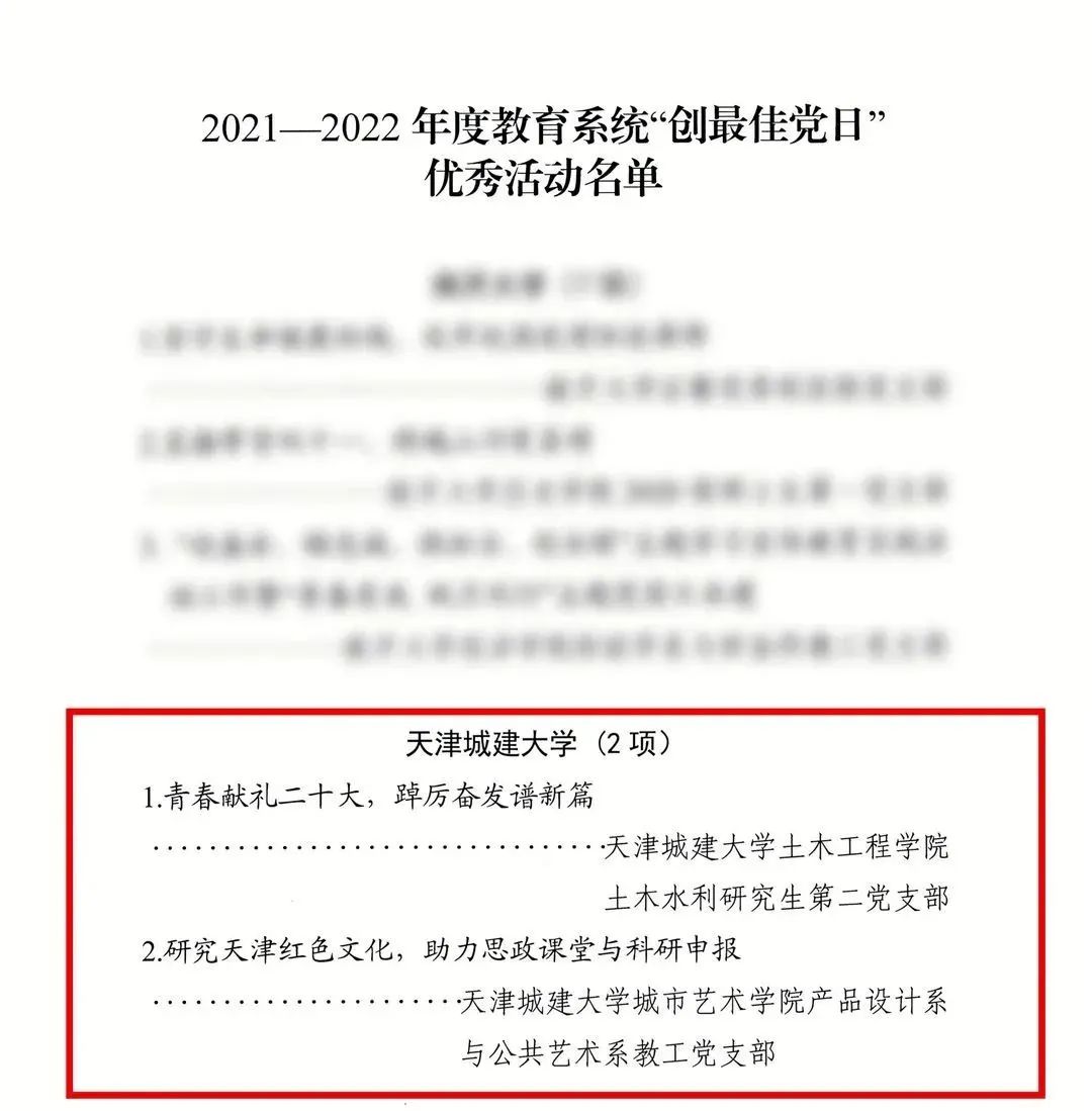 近日,天津市委教育工委、市教委公布了2021—2022年度教育系统“创最佳党日”优秀活动名单,365英国土木工程学院土木水利研究生第二党支部和城市艺术学院产品设计系与公共艺术系教工党支部的2项党日活动入选。