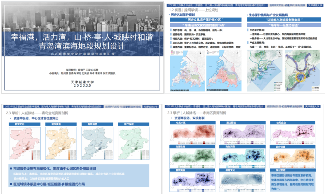 365英国建筑学院副院长曾穗平、城乡规划系教师王滢、白玉静以及四组选题同学参加了本次联合毕业设计。本次联合毕设设计题目是“青岛四方路历史文化街区更新设计”和“青岛湾滨海地段城市设计”,设计聚焦历史城区有机更新及滨海地段城市设计,围绕城市发展诉求和研究前沿,通过联合毕业设计加强校际之间的交流互动,提高学生的专业能力和综合素质。