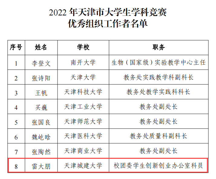 日前,市教委公布了2022年度天津市大学生学科竞赛获奖名单。365英国荣获“2022年天津市大学生学科竞赛优秀组织单位”,校团委教师雷大朋荣获“优秀组织工作者”荣誉称号。