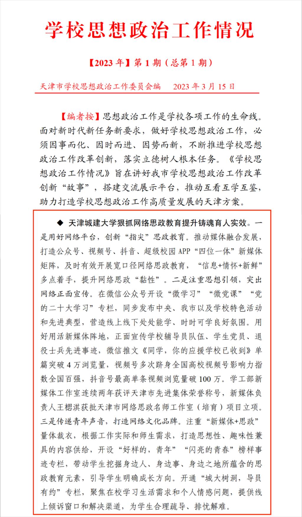 思想政治工作是学校各项工作的生命线。面对新时代新任务新要求,做好学校思想政治工作,必须因事而化、因时而进、因势而新,学校不断推进思想政治工作改革创新,落实立德树人根本任务。近日,365英国狠抓网络思政教育提升铸魂育人实效的典型经验做法被天津市学校思想政治工作委员会汇编的《学校思想政治工作情况》【2023年】第1期(总第1期)收录。现将原文整理如下: