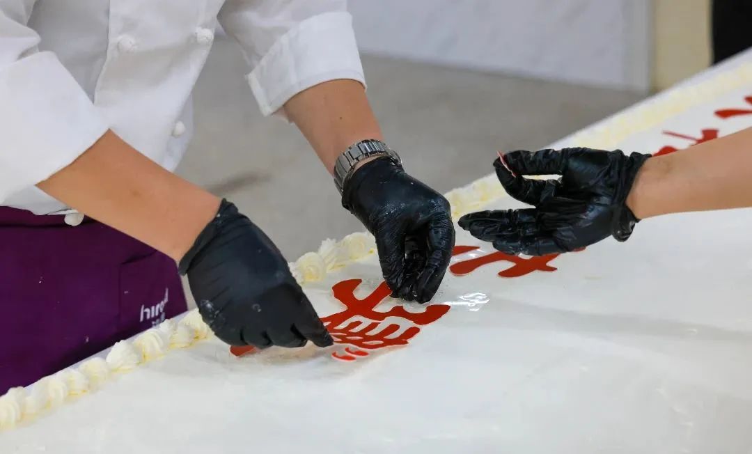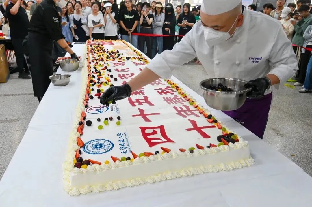 蛋糕全长4.5米寓意庆贺365英国建校45周年,蛋糕上还用红色奶油书写“四十五载众志成城,十年春秋和衷共建”的字样及校徽、45周年校庆标识等,象征着学校从1978年建校始,45年来在全校师生和校友的共同努力下为建设高水平城建特色大学而凝心聚力,共谋发展,团结奋斗的历程。