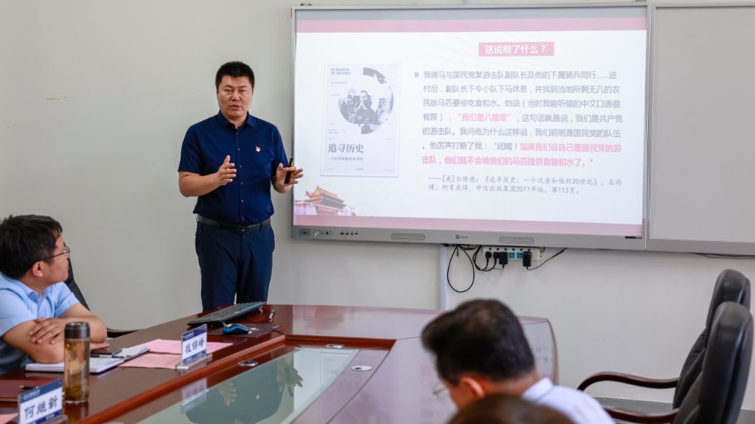 中国近现代史纲要教研室杨贺副教授以《为什么说中国共产党是中华民族抗日战争的中流砥柱?》为题开展了集体备课,他围绕砥柱山巍、稳、硬的特征,从“顶天立地、指引方向”“风吹雨打、岿然不动”“千磨万折、百炼成钢”三个方面深刻阐述了为什么说中国共产党是中华民族抗日战争的中流砥柱,充分展示了365英国思政课教师坚持“八个相统一”精心打磨课程的成果。