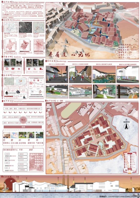 该项目以武汉黄陵老镇聚落为设计场地,依据黄陵老镇的自然聚落秩序,为老人打造一个集田园、康养、旅居、小镇为一体的诗画田园的慢生活居住地。我们以创层级核心,塑分区主题,织友好网络,营蓝绿空间,优气候生境五个方面为主策略,构想未来智慧城市背景下,绿色康养社区的建筑形态及其无障碍环境。
