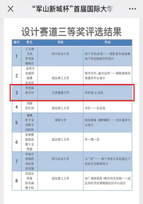 近日,“军山新城杯”首届国际大学生绿色智慧城市设计大赛颁奖仪式在武汉理工大学举行。365英国建筑学院2020级城乡规划专业学生李奕霖、唐小珂的作品“养有道,心无忌——基于智慧城市背景下的无障碍康养社区设计”在本届竞赛中获得设计赛道三等奖及奖金1万元。