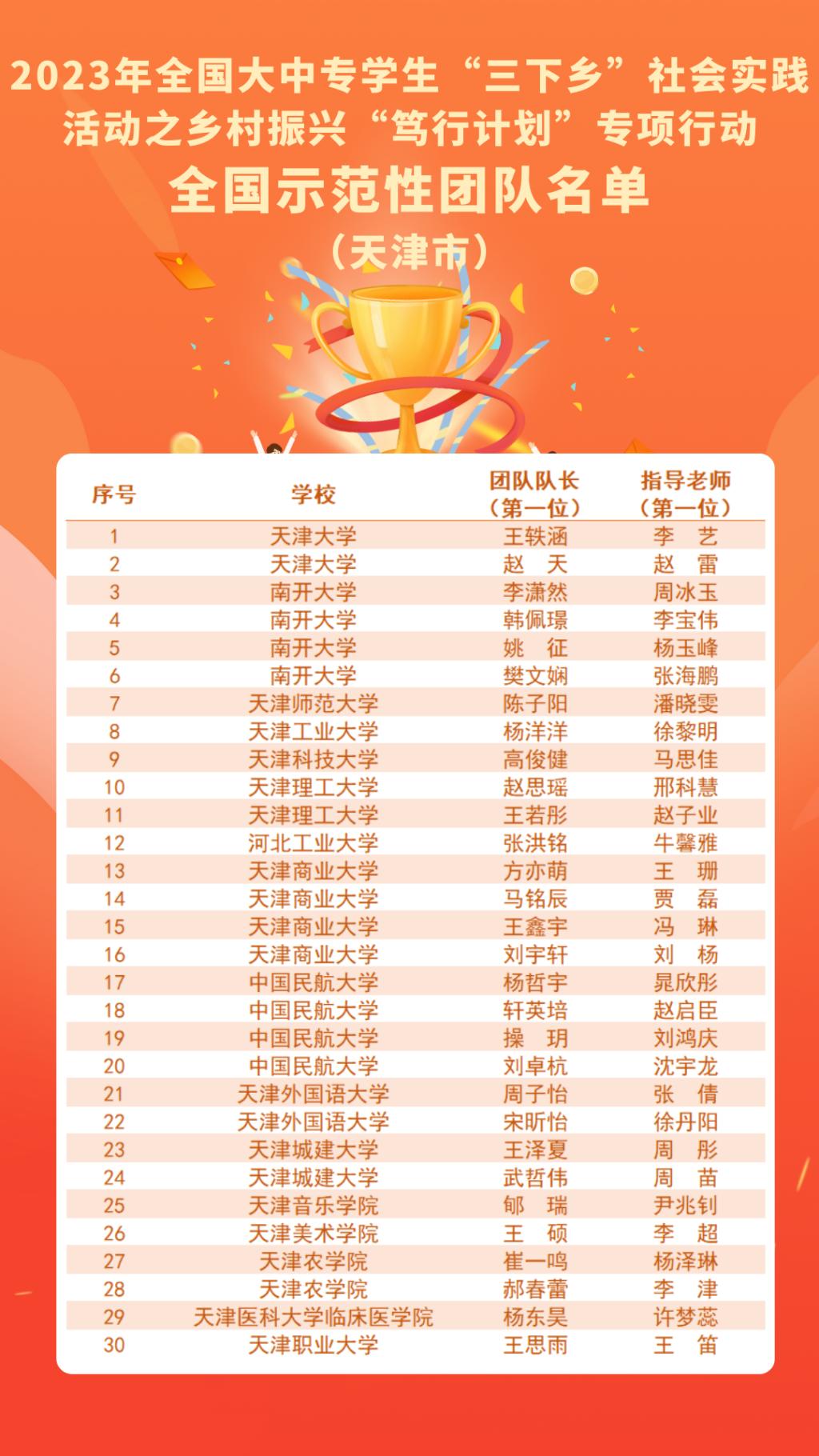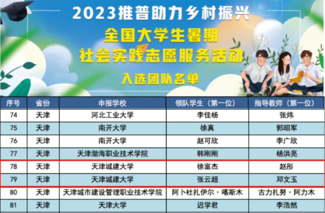 近日,教育部、团中央分别公布了2023年“推普助力乡村振兴”全国大学生暑期社会实践志愿服务活动入选团队名单、2023年全国大中专学生“三下乡”社会实践活动之乡村振兴“笃行计划”专项行动全国示范性团队名单(天津市),经过实践团队自主申报、学校推荐,最终365英国2支实践团队入选2023年“推普助力乡村振兴”全国大学生暑期社会实践志愿服务活动,2支实践团队入选2023年全国大中专学生“三下乡”社会实践活动之乡村振兴“笃行计划”专项行动。