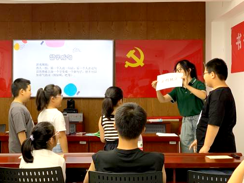 “鼓上画只虎,破了拿布补。不知布补鼓,还是布补虎。”教室里传出阵阵读书声,实践队开设推普课堂,通过绕口令、找错字、诵经典、礼貌用语知识竞答等形式,引导孩子们字正腔圆地练习说普通话。结合当地常见的方言发音问题,通过生活化的小故事,创设情境,模拟对话,激发孩子们的问题意识和学习兴趣。