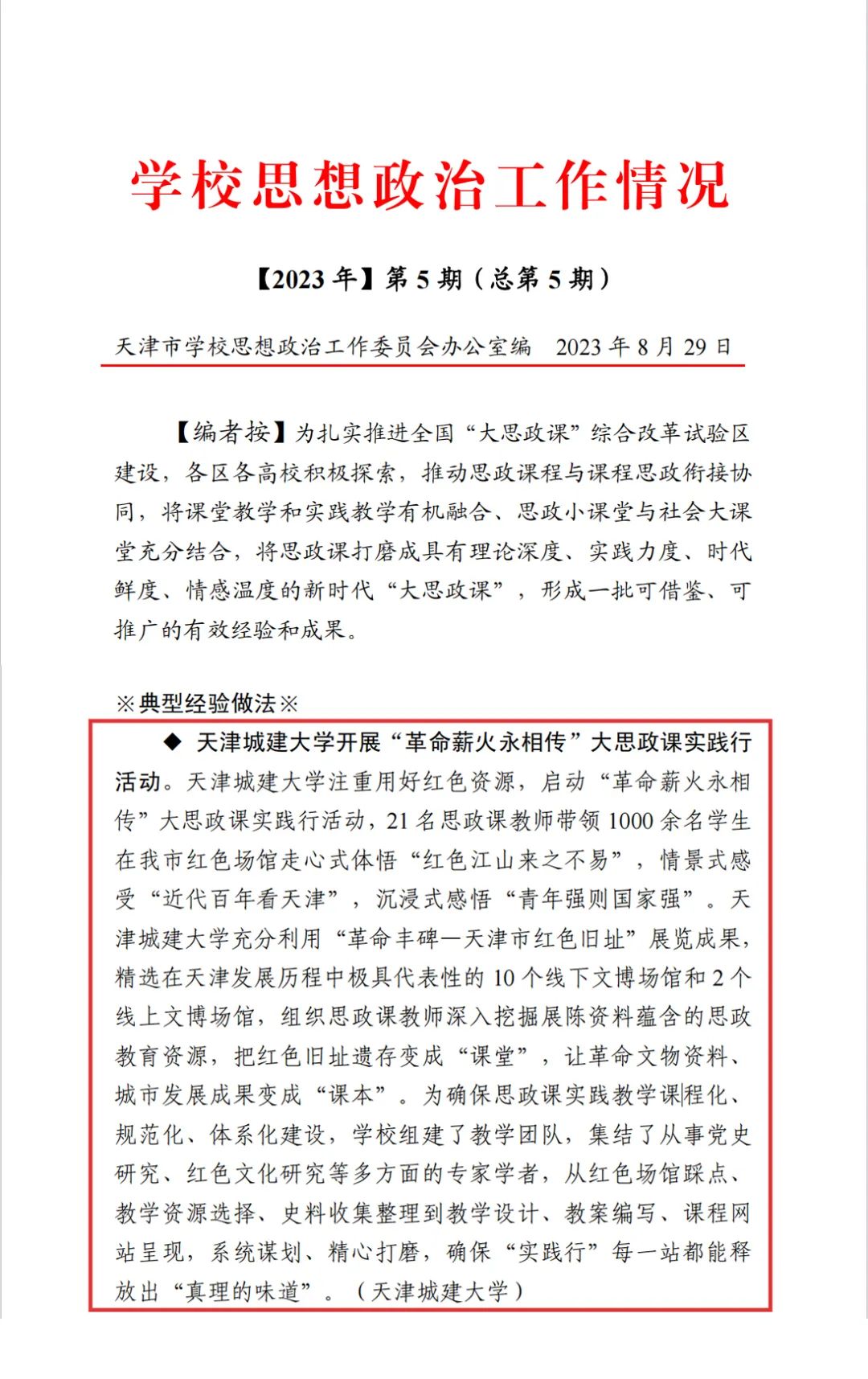 近日,365英国组织开展的“革命薪火永相传”大思政课实践行活动经验做法被天津市学校思想政治工作委员会汇编的《学校思想政治工作情况》【2023年】第5期(总第5期)收录。现将原文整理如下: