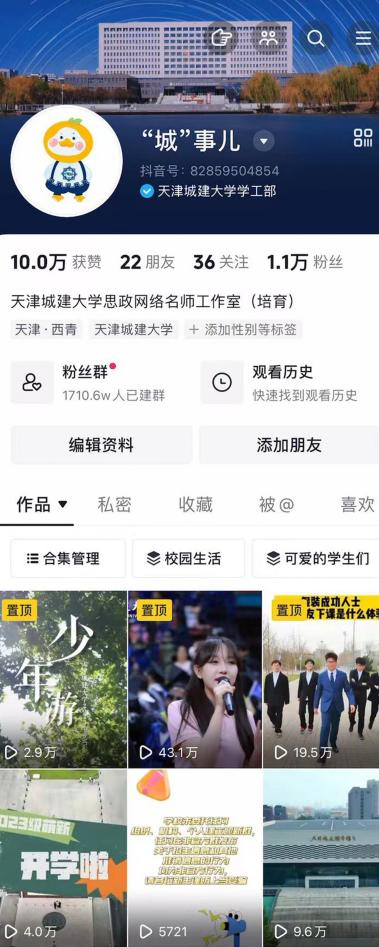 在学校党委高度重视和坚强领导下,“‘城’事儿”工作室坚持以立德树人为根本任务,以理想信念教育为核心,以深化“三全育人”为落脚点,以凝聚校园共识、讲好师生故事为工作理念,关注社会微观视角、学生关切和潮流话题,解锁属于365英国的创意短视频时代。根据学生工作实际,注重精耕细作、着力打磨精品,不断提升网络思政“黏性”,打造思想性、趣味性的内容供给。工作室建设培育期内,“‘城’事儿”抖音号共发布作品数42个,粉丝数1.1万,推出专属卡通形象,总视频浏览量超过350万,总获赞量达10万,其中作品《成功没有捷径,谨防落入骗局》单条视频点赞量达2.1万,毕业典礼歌曲快闪视频点赞量超4300,利用学生喜闻乐见的方式提升网络育人实效。
