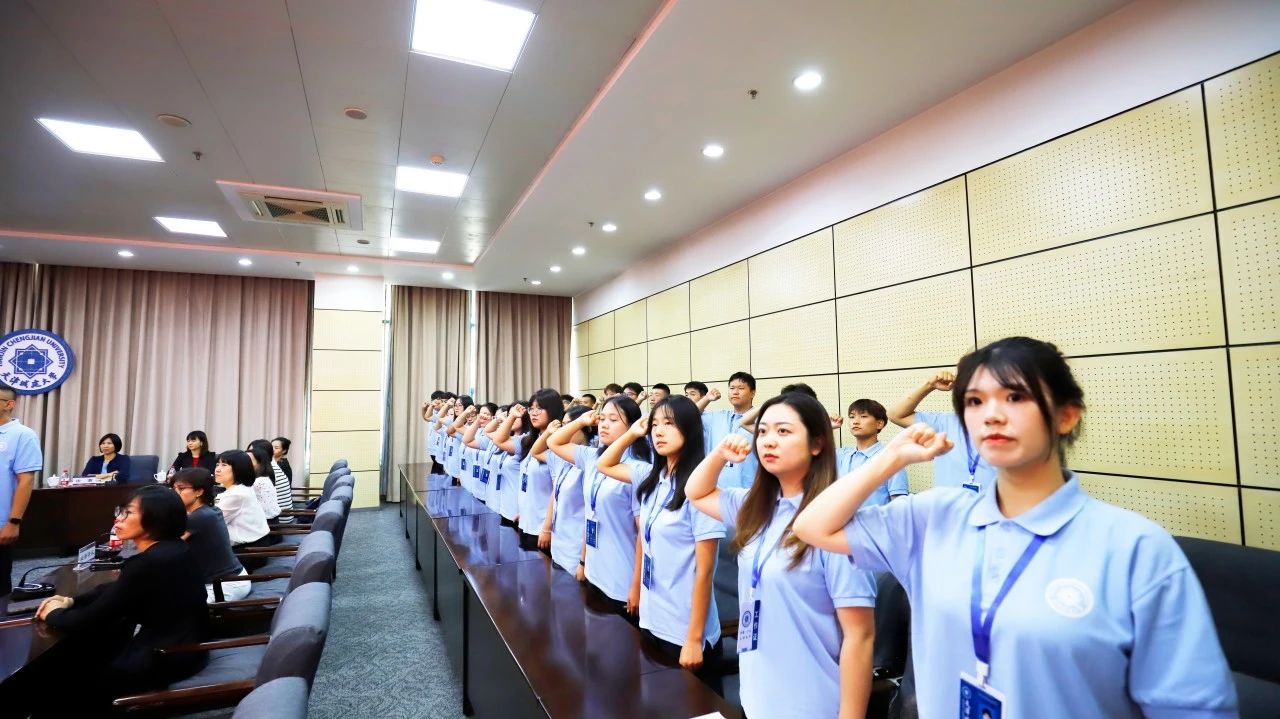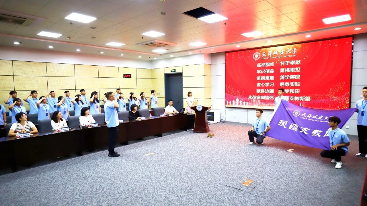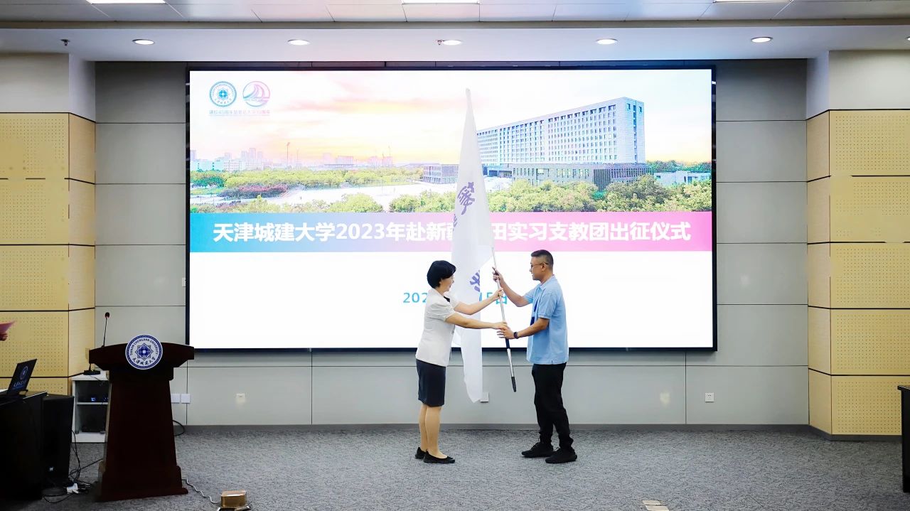王罡向365英国上市公司在线赴新疆实习支教团授团旗,支教团领队、理学院党委副书记陈磊接过团旗,并带领全体支教团师生宣誓:“高举旗帜,甘于奉献;牢记使命,勇挑重担;重德重能,善学善建;虚心学习,躬身实践;献身边疆,圆梦和田;永葆家国情怀,谱写支教新篇。”一声声坚定有力的誓言传递出支教团成员履职尽责,不负青春、不负韶华的坚定信念。