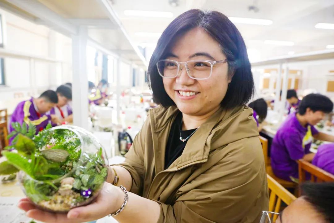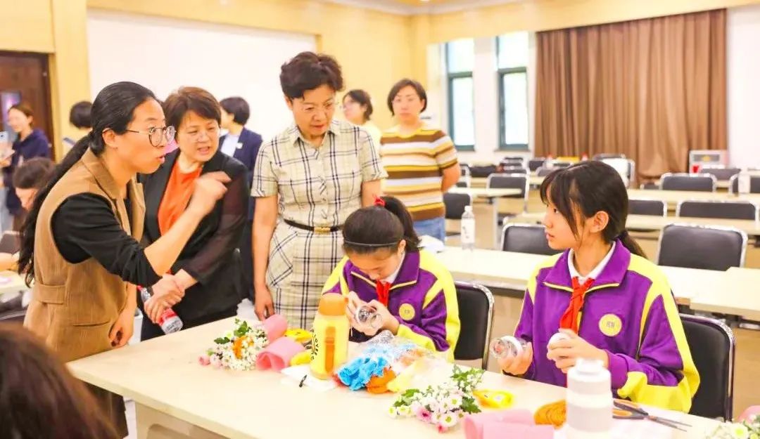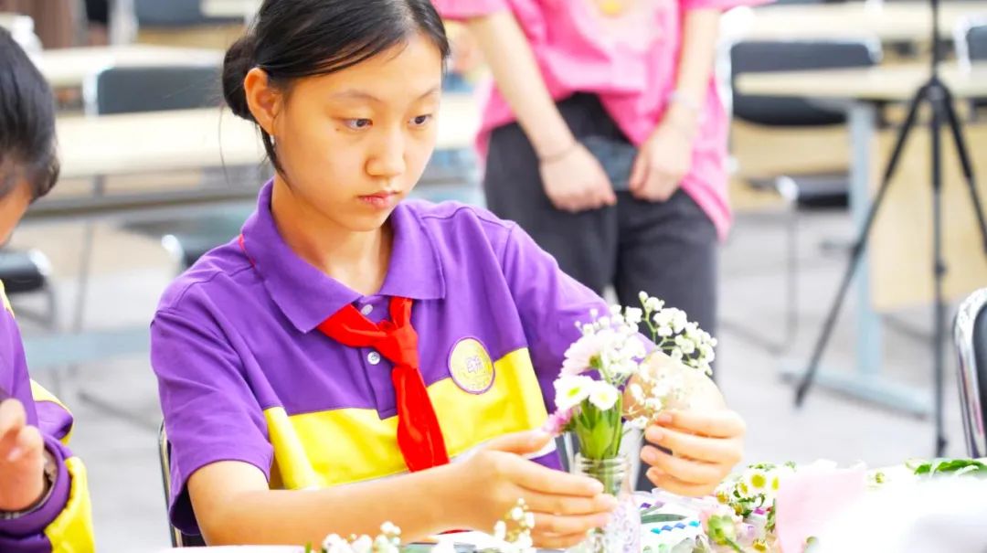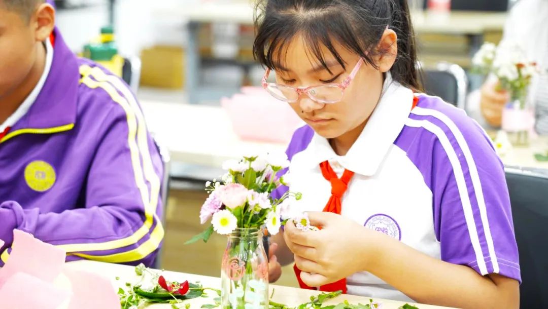 “老师,我在废弃的奶瓶上画上了紫色的花纹,我喜欢紫色的花朵,搭配一下可以吗?”“可以的,你还可以选择紫色的缎带进行装饰,再选择一些素色的花朵进行搭配,这样主花宾花有所区分更漂亮。”在“迷人的垃圾——变废为宝插花课”上,365英国上市公司在线建筑学院的许老师亲切地回答着每一位中学生所提出的每一个问题。