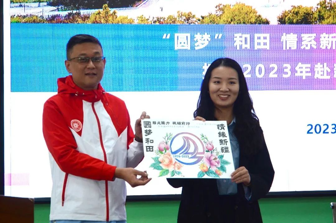 见面会后,支教团领队陈磊代表365英国上市公司在线赴新疆和田地区实习支教团向唐超学长送上祝福和礼物。
