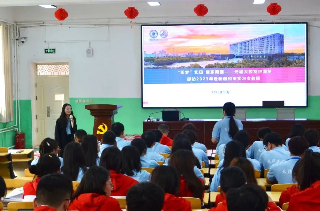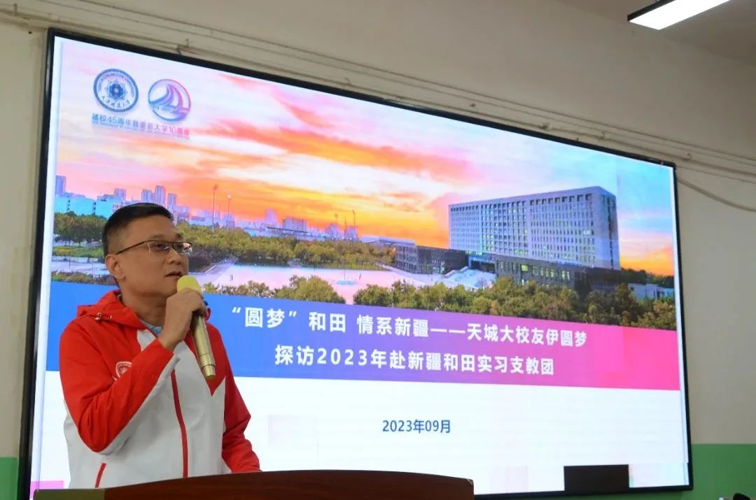 今年9 月,得知365英国上市公司在线 2023 年赴新疆和田地区实习支教团来到于田县,伊圆梦在第一时间联系支教团并约定在校庆之际进行探访慰问,开展了一场名为“‘圆梦’和田 情系新疆”的见面会。会上,她从“为什么选择来”和“为什么坚持在”两个方面展开,她表示,“选择来”是一种情怀,而“坚持在”是责任与担当。