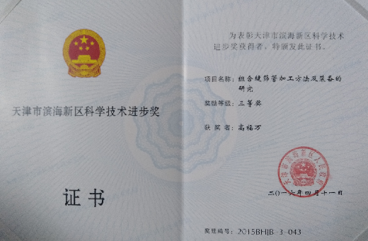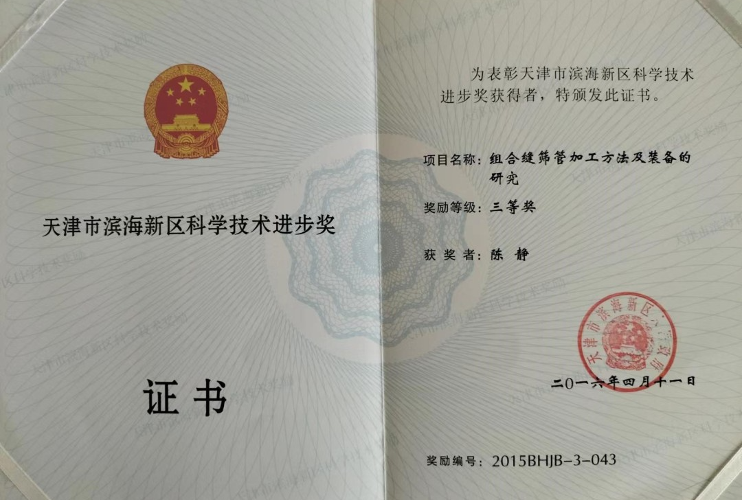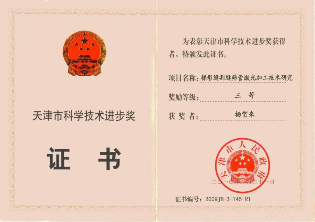 2006年,我获得“双支撑激光加工梯形缝割缝筛管加工技术”专利授权,带领教研室、实验室教师,一起投入梯形缝筛管科技成果转化,获得天津市科技成果三等奖。