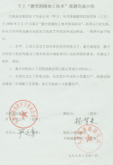 评上劳模后我没有停步。我想,任何加工方法不会唯一,经过反复研究,我提出用激光加工割缝筛管。当时咨询一些专家,他们认为激光属于精密加工,不可能在石油套管这种毛坯件上割缝。国内外根本没有人用激光加工割缝筛管,有人曾做过实验,但失败了,管体内部挂渣严重,生产无法使用。我认为国内外没有人干,我可以试一试,别人干不成的,我不一定干不成。1994年1月15日,我向学校领导递交“激光加工割缝筛管的可行性研究报告”, 1998年3月17日,我代表学校与大港油田井下作业公司签订协议,帮助该公司在世界上首次把激光加工技术成功地应用到割缝筛管加工中,并迅速推广到全国。激光加工至今成为油田认可的割缝筛管主要加工技术,激光加工的割缝筛管在国内外油田生产中得到了广泛应用。
