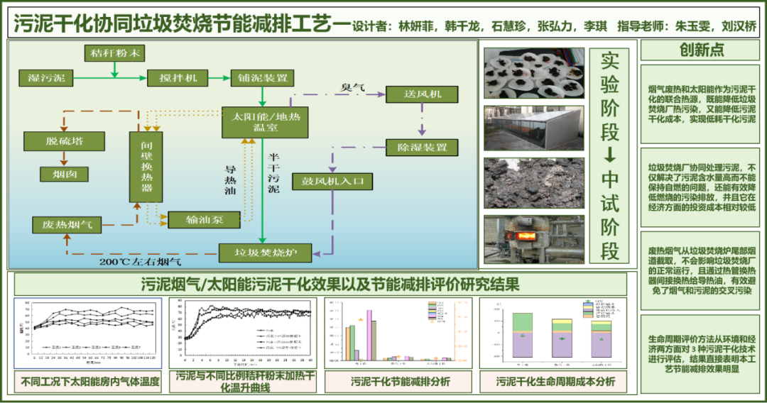 随着污水处理技术的快速发展以及严格的环境保护要求,污泥处理与利用已成为一个日益严峻的挑战。本研究将烟气废热/太阳能污泥干化和垃圾焚烧处理相结合,提出了污泥干化协同垃圾焚烧节能减排工艺,不仅可以充分利用现有垃圾焚烧厂的废热烟气作为干化热源,减少能源消耗,有效降低运行成本,而且利用了可再生能源太阳能作为能源来源,满足可持续发展的需求。基于上述工艺中的太阳能/烟气干化污泥关键技术开发,我们搭建烟气/太阳能小试、中试装置,设置多种工况进行试验研究,考察了不同秸秆掺比、地热温度等因素对污泥干化效果的影响,确定了最佳工艺参数。基于中试实验结果,进一步将工程放大的烟气/太阳能干化污泥技术耦合到实际垃圾焚烧工艺,通过生命周期评价方法开展节能减排评价研究。