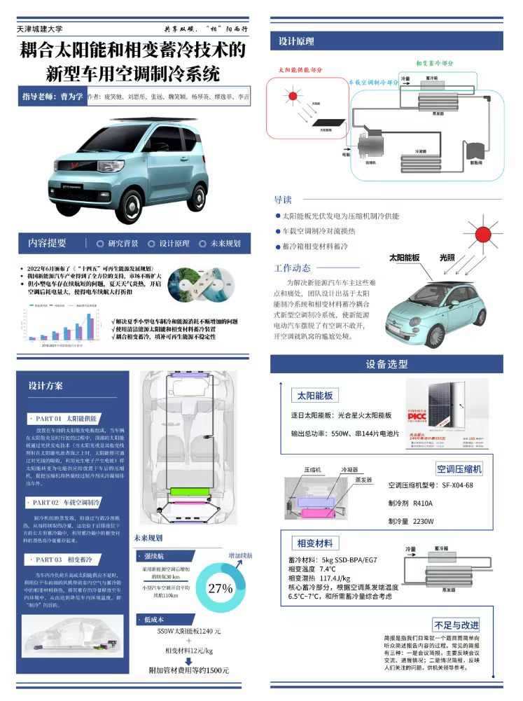 现如今小型电车方便小巧的特点深受广大消费者的欢迎,但小型电车普遍存在续航短的问题,开启空调使得电车续航大打折扣。为解决夏季小型电车制冷系统开启后车辆续航压力增大的问题,我们设计出耦合太阳能和相变蓄冷技术的新型车用空调制冷系统。一方面利用了一次能源太阳能供能,间接降低车辆能耗,使其二氧化碳排放量降低,更为节能环保;同时创新性的采用相变材料蓄冷技术,有效解决了太阳能发电供能强度不稳定的问题,也避免了传统新能源发电利用电池储能导致的充电储能速度有限、维护成本高等问题。