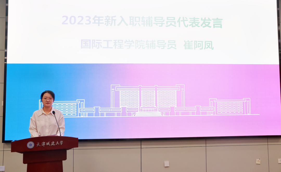 国际工程学院辅导员崔阿凤作为新入职辅导员代表发言,表示将不断锤炼过硬本领,用自己扎实的学识视野、优良的修养品德和浓厚的职业情怀来感染学生、带动学生、成就学生,为学校育人工作高质量发展保驾护航。
