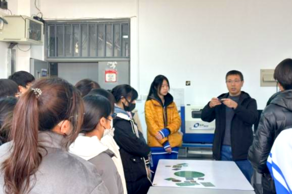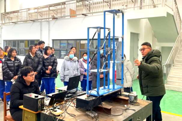 在土木工程学院结构实验中心,结构实验室教师任权昌、杨磊,介绍了地震模拟震动台的系统参数和应用场景,讲解了即有结构的应力、变形和自振频率的监测原理和现场演示。学生们进入高校实验室,近距离的接触大型科研设备,心情十分激动,点燃了科技强国的热情。