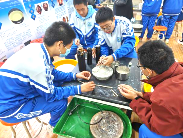 在材料科学与工程学院的“材料文化空间”讲解过程中,同学们惊叹材料的魅力,感受材料的发展不仅促使生物医学、人工智能、航空航天等领域的进步,还为建造科技型社会奠定了坚实的基础。在陶艺制作课上,学生们通过专业教师的讲解,将泥浆通过拉坯、注浆两种成型方式得到陶瓷坯体器皿,并进行彩绘,提升了对陶艺制作的理解,增强了动手能力,引导学生感悟中华传统陶艺之美。