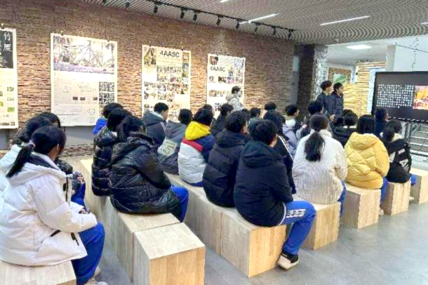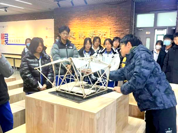 在建筑学院,建筑学专业学生采用视频、模型、图纸等多种方式,与高中师生分享参加第4届亚洲建筑学生论坛中以“竹构建筑可持续设计”为主题的建构工作营情况,激发了访学学生对工作模型、竹构节点、设计图纸的浓厚兴趣,开拓了学生的眼界,提升了学生对建筑的认识。