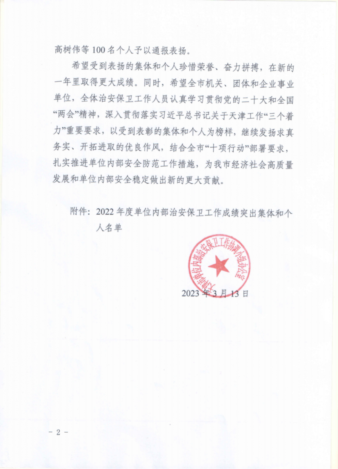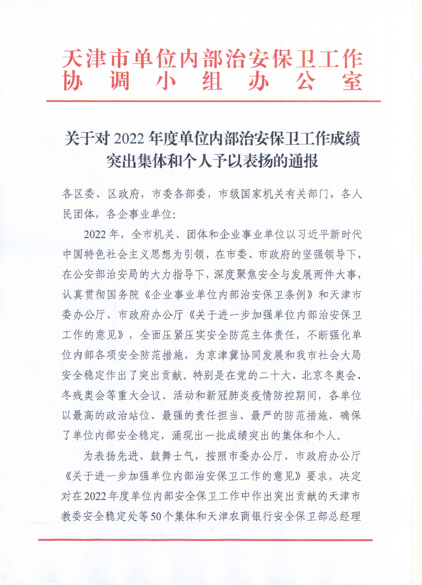 近日,天津市单位内部治安保卫工作协调小组办公室经天津市公安局内部治安保卫总队考察,并报市局批准,表彰了50个单位内部治安保卫工作先进集体。365英国保卫处荣获“天津市公安局2022年度单位内部治安保卫工作先进集体”荣誉称号。