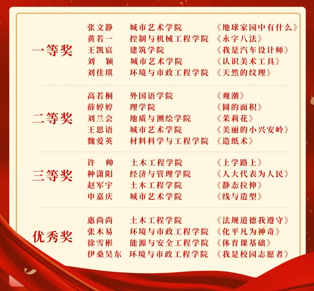 评委针对参赛教师的现场表现,从教学内容、教学组织、语言教态、教学特色等各个方面逐一进行点评并提出建议。支教团的“小老师们”与评委进行充分交流和请教,纷纷表示受益匪浅,一定会认真吸取评委建议,融会贯通,提高课堂教学质量。经过紧张激烈的角逐和比拼,大赛评选出一等奖9名、二等奖8名、三等奖7名以及优秀奖6名。
