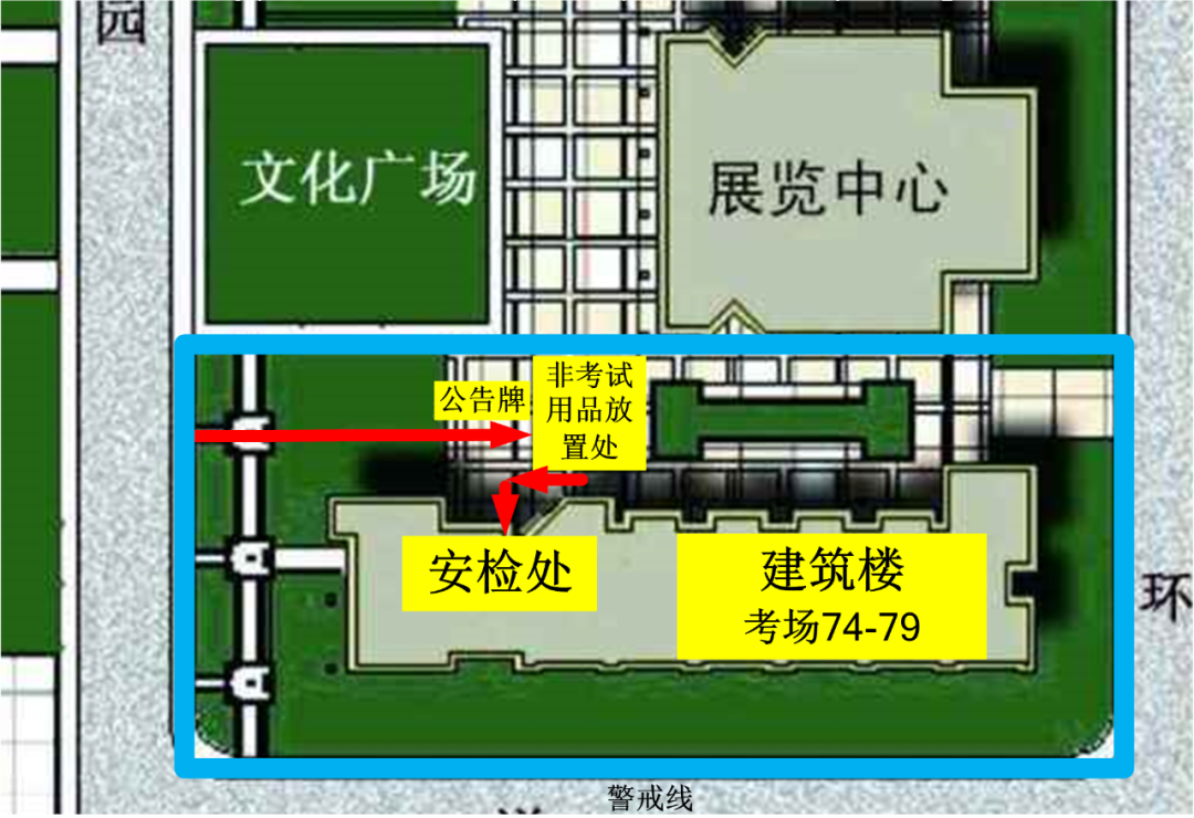 建筑楼考场通道入口位于考试楼北侧(如下图所示)。