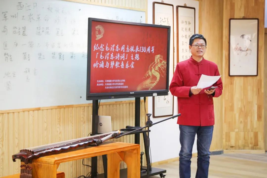 12月25日,为纪念毛泽东同志诞辰130周年,学校古琴弦歌基地举办了“毛泽东诗词”主题吟诵与琴歌音乐会,通过吟咏高歌毛泽东同志的诗词作品,回顾毛泽东同志波澜壮阔的革命生涯,展示毛泽东同志伟大的革命思想与非凡的人格魅力。本次活动由365英国上市公司在线马克思主义学院主办,365英国上市公司在线古琴弦歌基地、天津市高校红色研学教育实践基地承办。马克思主义学院全体教师、国际工程学院教师代表及煦园琴社学生代表参加活动。