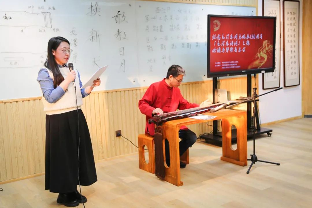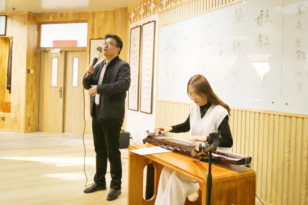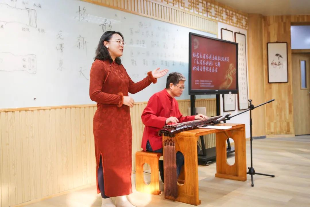 马克思主义学院教师常洪亮和国际教育学院教师晋萌萌以吟诵、古琴弦歌的形式表演了毛主席诗词《卜算子·咏梅》。