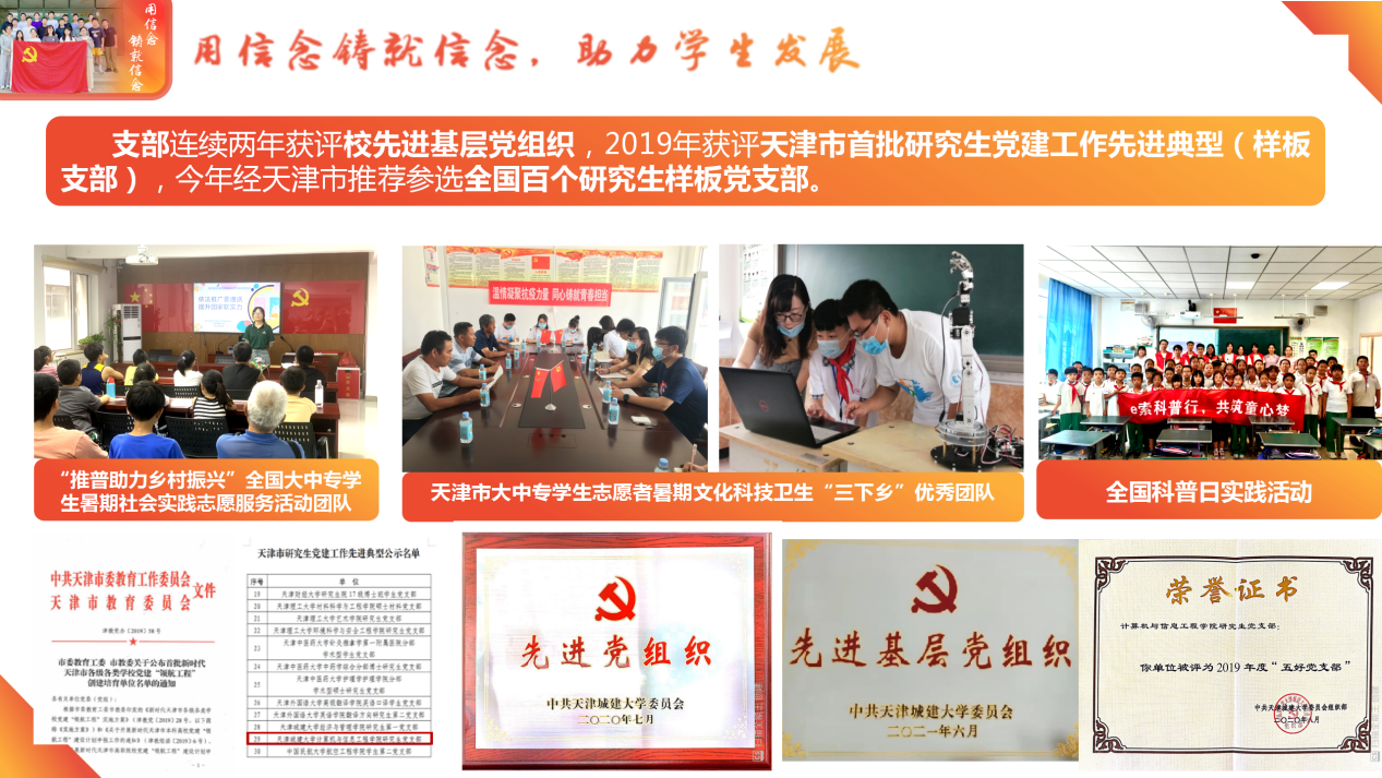 四年的工作经历,四年的支部书记。她始终用心带支部,用心培养学生党员,打造“一线四抓三融合”的党建特色研究生党支部,促进党建工作与志愿服务、与乡村振兴、与区域经济社会发展相融合。支部连续两年获评校先进基层党组织,并经天津市推荐参选全国百个研究生样板党支部。