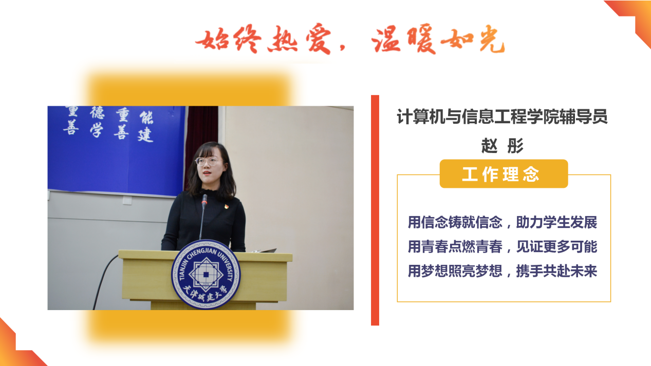赵彤,计算机与信息工程学院辅导员,获得天津市优秀辅导员、天津市“三下乡”社会实践活动优秀团队、校辅导员素质能力大赛一等奖、二等奖等荣誉。