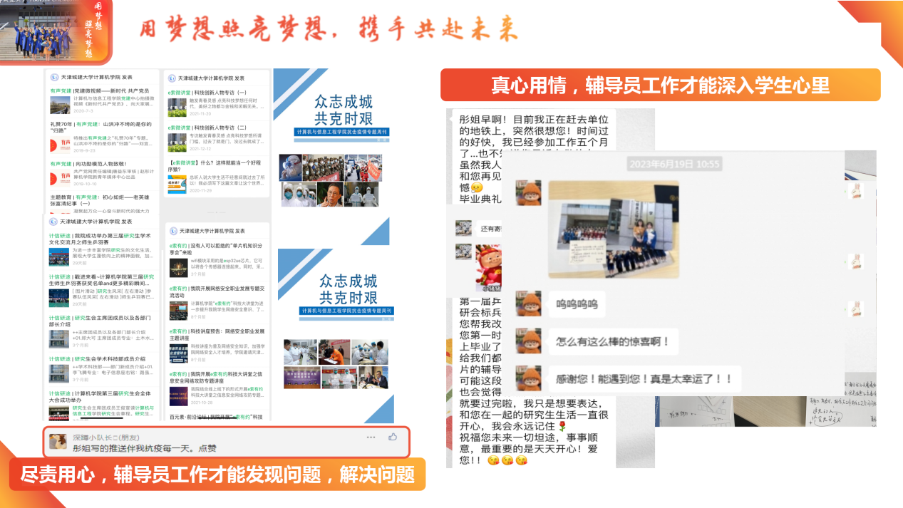 尽责用心,辅导员工作才能发现问题,解决问题。曾担任学院宣传员,积极挖掘学生关注热点,抓住教育契机,依托学院官微、官网,打造“有声党建”、“计信研途”、“e索微讲堂”等品牌栏目,推进网络思政教育建设。