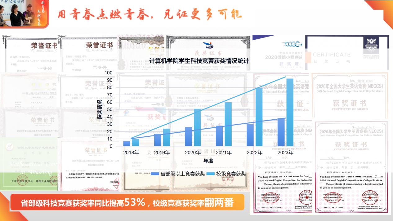 作为一名工科专业背景的辅导员,她深知实践能力对于工科学生的重要性。从大一的新生科技宣讲、到大二专业分流后的分专业竞赛梳理,从依托学院e索众创空间孕育创新成果雏形,再到抓牢科技竞赛以赛促学以赛促练,形成“e索领航”学生双创工作体系,累计开展众创空间路演8次,承办校级科技竞赛11项,开展科技讲座25场,举办科技创新培训32场,覆盖学生4000余人次。学院学生省部级科技竞赛获奖率同比提高53%,校级竞赛获奖率翻两番。这些数据的逐年增长也让她更加坚信,强化科技育人,方能见证学生的更多可能。