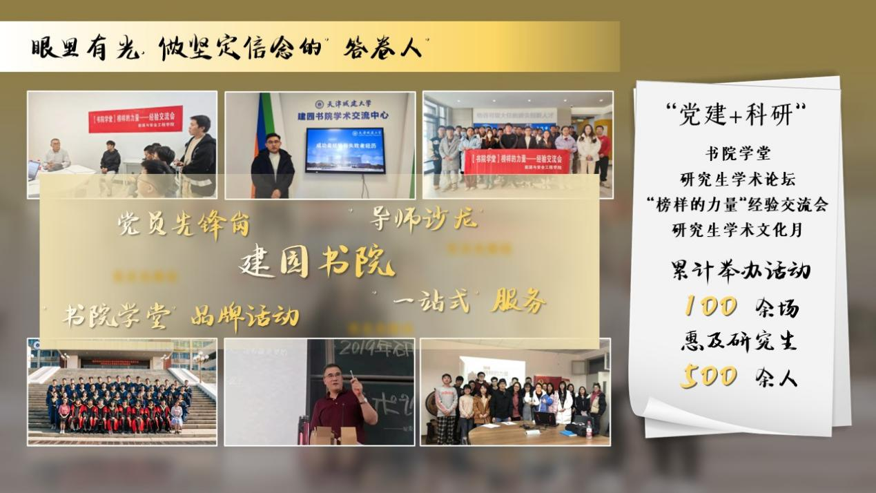 以学生党建为龙头,以组织建设为重点,以“一站式”社区建设为依托,促进研究生教育管理精细化。以“党建+科研”,打造了“书院学堂”、研究生学术论坛、“榜样的力量——经验交流会”、研究生学术文化月等,累计举办活动100余场,惠及研究生500余人,让思政教育自然沁入学生心田。