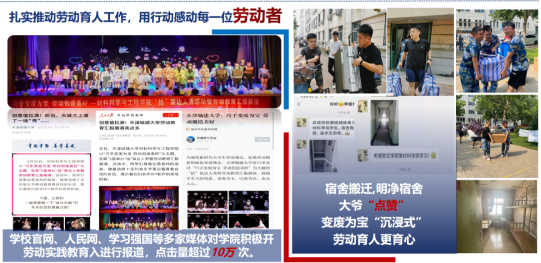 以“劳”润心,以“动”启智。宿舍搬迁,他和同学们一起将楼宇打扫干净再告别,宿管大爷“点赞”;变废为宝“沉浸式”劳动活动被人民日报、学习强国多家媒体报道,点击量超10万次。