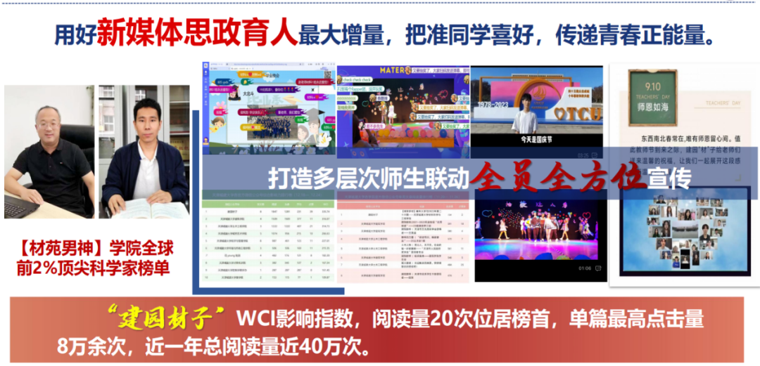 科技赋能,助力材子才上添彩。引导材子树立科技报国理想,指导学生获中国大学生自强之星年度人物1次,科技竞赛等各项奖励40余项。新媒体新活力,用好新媒体最大增量。他积极打造师生联动全方位宣传平台,“建园材子”WCI影响指数多次位居榜首,单篇最高点击量超8万次,年阅读总量近40万。