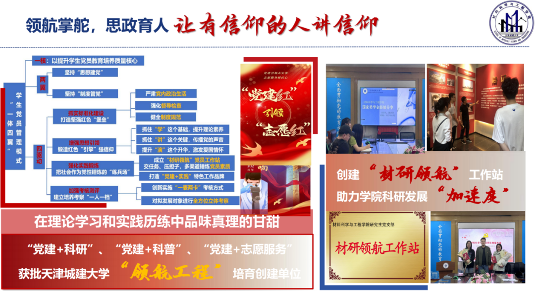做好学生思想理论教育和价值引领是辅导员的第一要务。刘凯依托学院研究生党支部,构建“一体四翼”党员管理模式,成立“材研领航”工作站,助力学院发展加速度。