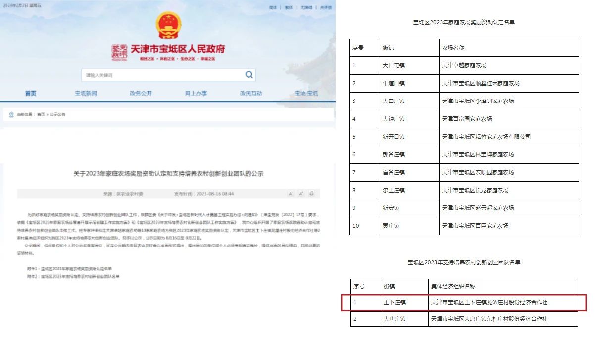 2023年8月工作队进行了“宝坻区2023年农村创新创业团队”的申报工作,经过层层选拔,“天津市宝坻区王卜庄镇龙潭庄村股份经济合作社”成功获评“宝坻区2023年支持培养农村创新创业团队”(全区获批两个)。