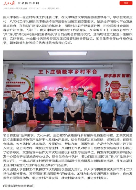 积极引进“文旅智营—津门礼物”专业品牌研发团队,做好“品牌强农”这篇文章。由工作队牵头,“‘津门礼物’”助力乡村振兴促消费系列项目”落地宝坻王卜庄镇,项目围绕村庄农产品提质升级进行乡村振兴礼物生态构建,同时,汇聚优势资源打造宝坻区特色农产品伴手礼及相关产业链。人民日报、津云、天津日报、党建网、新浪网等多家媒体进行了相关报道,得到了广泛的社会关注。